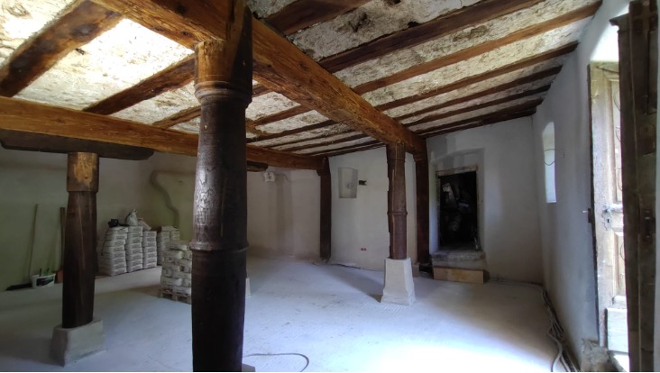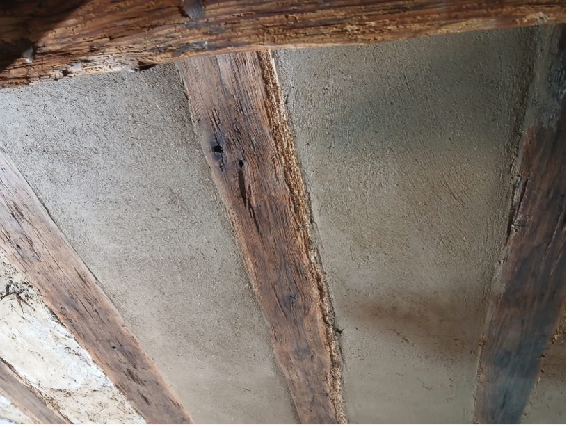 Weiter ging es mit der Restaurierung der historischen Balkendecke im Mühlenraum. Wie man in den Bildern gut entdecken kann, hat sich der Etagenbalken zu offenen Seite stark gesengt. Diese Senkung zieht sich durch das ganze Haus. Der Balken wurde von der Zimmermannsfirma ungefähr 15cm hochgedrückt. Vollständig zurückdrücken war nicht möglich, da das Holz sich in den Jahrhunderten an die Verformung angepasst hatte. Dadurch waren die Putzfelder auch stark beschädigt.